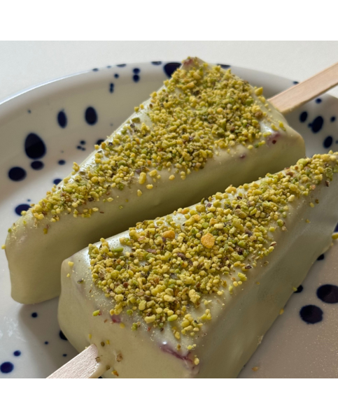 Pistacjowy serniczek na patyku łączy w sobie domowe sable z dodatkiem pistacji, kremowy sernik z naturalną pastą pistacjową, slodko-kwaśną żelkę z marakuji i glazurę posypaną pistacjami.